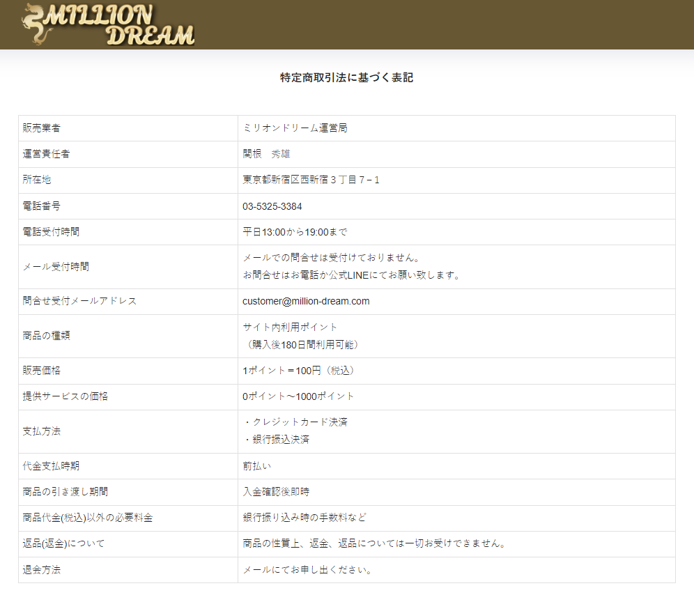 | 運営法人 | 不明(ミリオンドリーム運営局は法人ではない) |