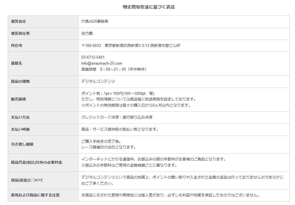 まず、サイト内に表示されている「特定商取引法に基づく表記」を確認しました。そこから判明した穴馬ch25の基本情報は以下の通りです。